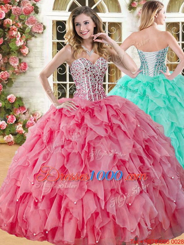 Coral Red Lace Up Quinceanera Dress Beading and Ruffles Sleeveless Floor Length