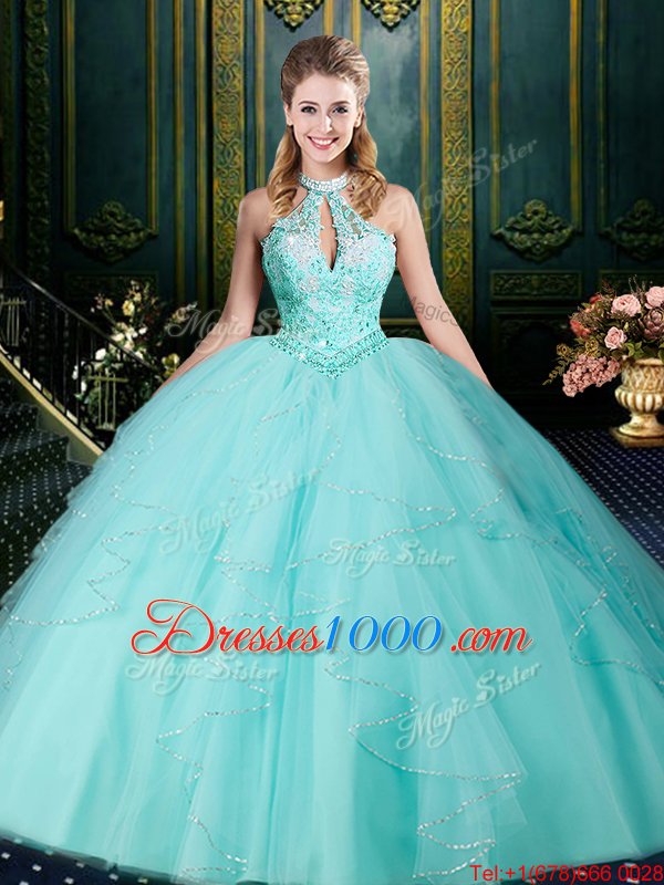 Smart Lavender Lace Up Halter Top Beading and Lace and Ruffles Quince Ball Gowns Tulle Sleeveless