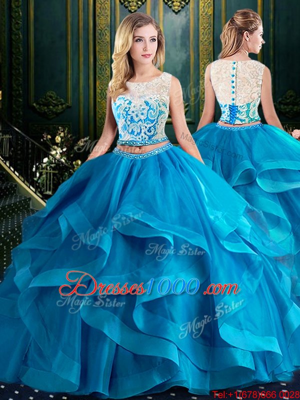 Brush Train Two Pieces Vestidos de Quinceanera Baby Blue Scoop Tulle Sleeveless With Train Zipper