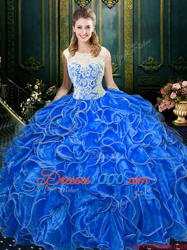 Royal Blue Ball Gowns Scoop Sleeveless Organza Floor Length Zipper Lace and Ruffles Vestidos de Quinceanera