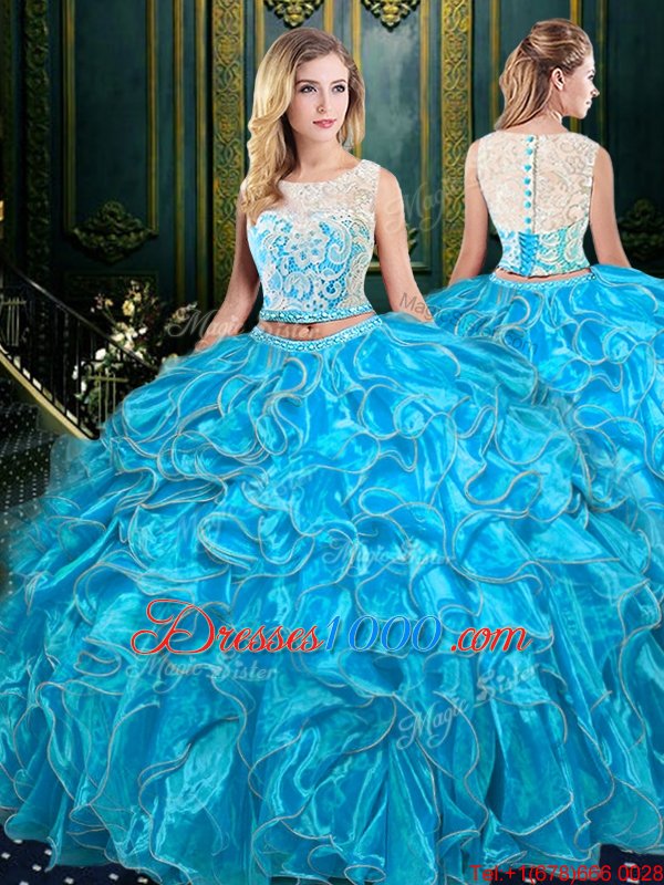 Scoop Sleeveless Quinceanera Dress Floor Length Lace and Ruffles Baby Blue Organza