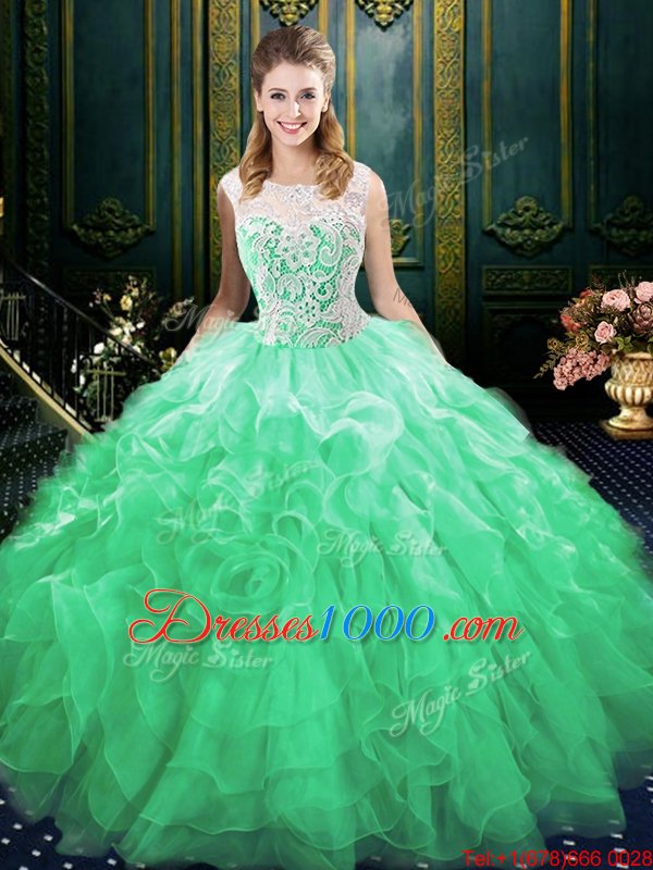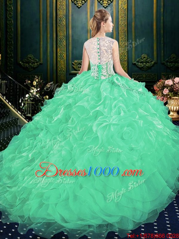 Discount Scoop Green Sweet 16 Dresses Organza and Tulle Brush Train Sleeveless Appliques and Ruffles