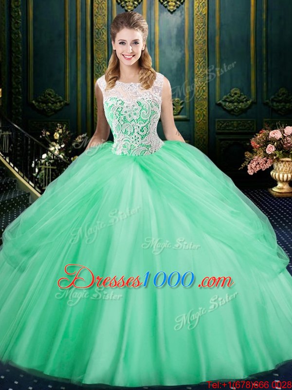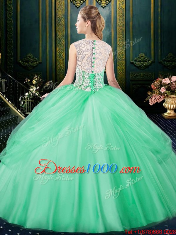 Inexpensive Scoop Apple Green Sleeveless Lace and Pick Ups Floor Length Sweet 16 Dresses