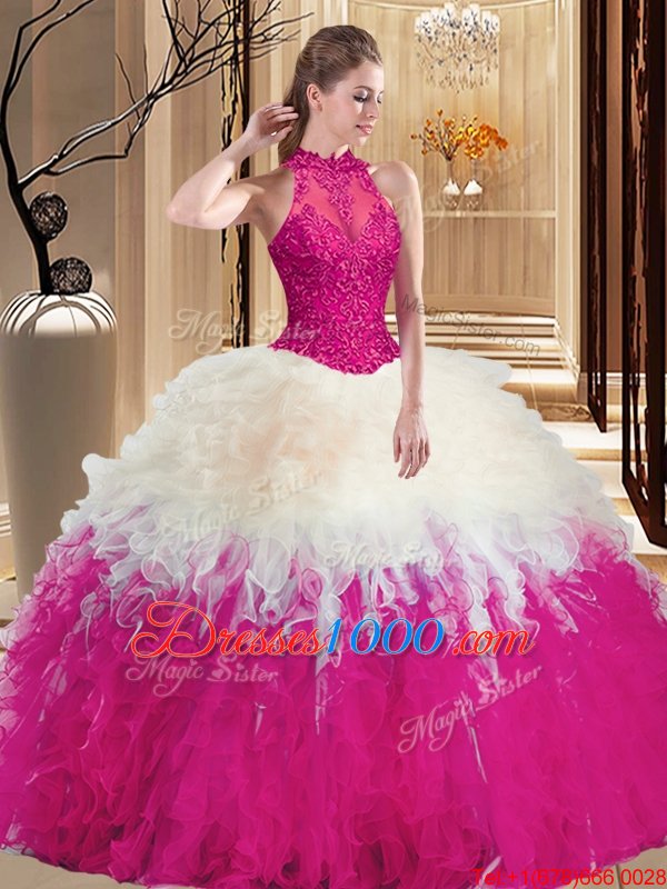 Multi-color Backless High-neck Lace and Appliques and Ruffles Quinceanera Gown Tulle Sleeveless
