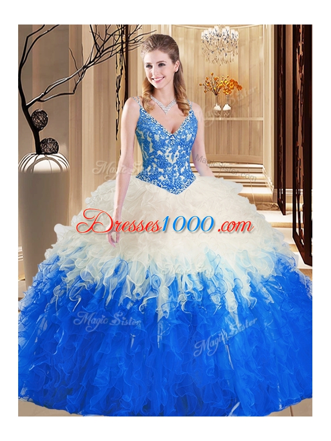 Simple Blue And White Quince Ball Gowns Military Ball and Sweet 16 and Quinceanera and For with Lace and Ruffles Straps Sleeveless Lace Up