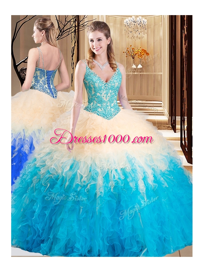 Beauteous Multi-color Lace Up V-neck Lace and Ruffles Quinceanera Gown Tulle Sleeveless