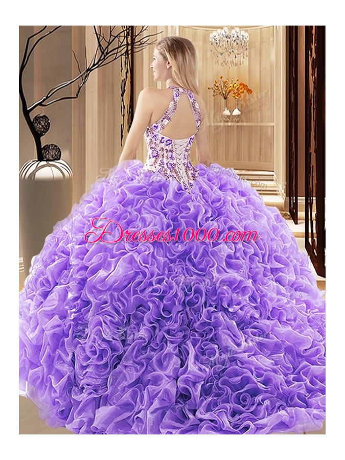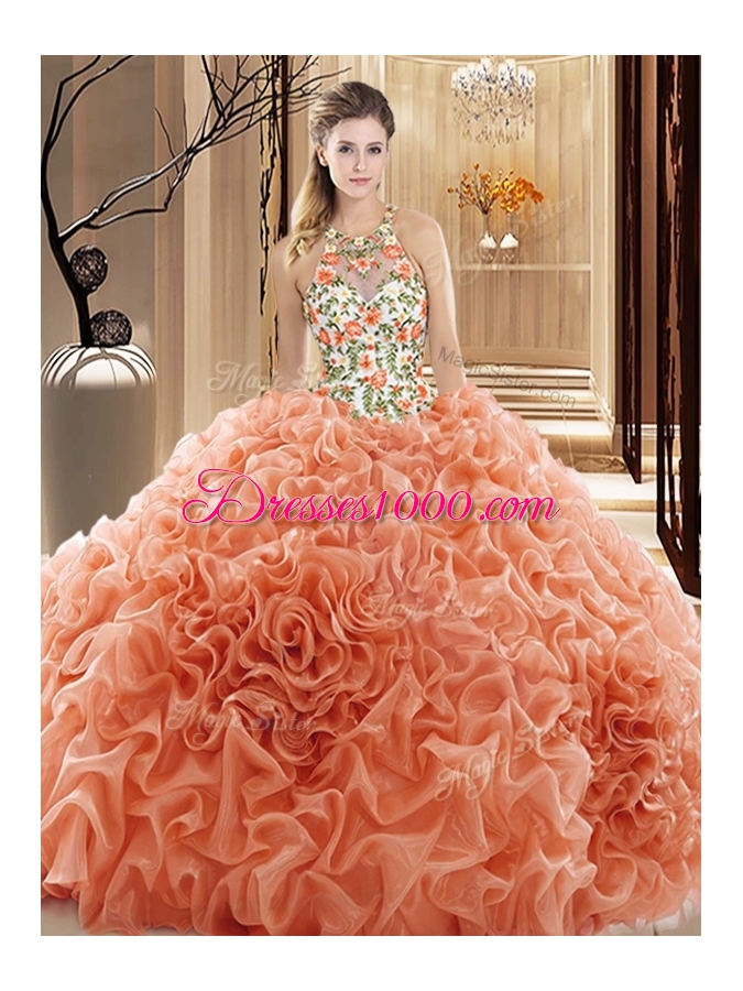 Top Selling Peach High-neck Neckline Embroidery and Ruffles Quinceanera Gown Sleeveless Backless
