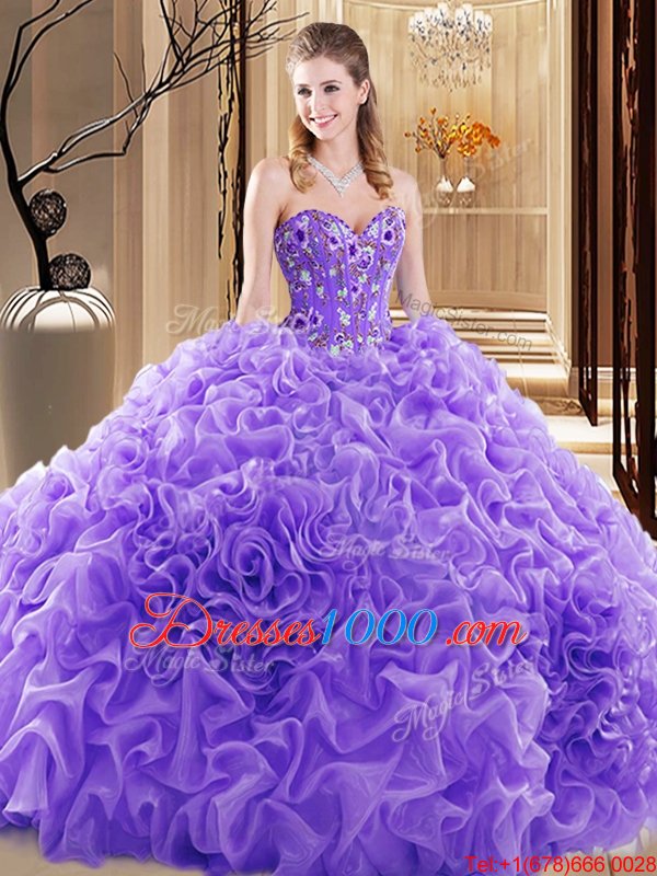 Elegant Lavender Fabric With Rolling Flowers Lace Up Sweetheart Sleeveless Vestidos de Quinceanera Court Train Embroidery and Ruffles and Pick Ups