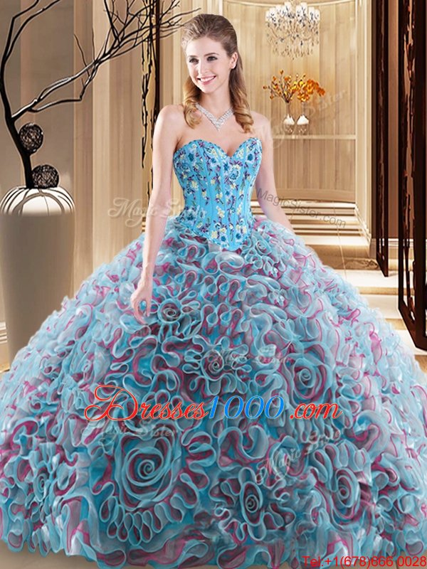 Luxurious Multi-color Lace Up Sweet 16 Dress Embroidery and Ruffles Sleeveless With Brush Train