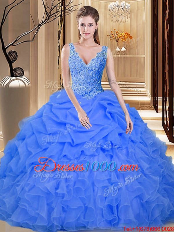 Backless Blue Sleeveless Lace and Appliques and Ruffles and Pick Ups Floor Length Sweet 16 Quinceanera Dress