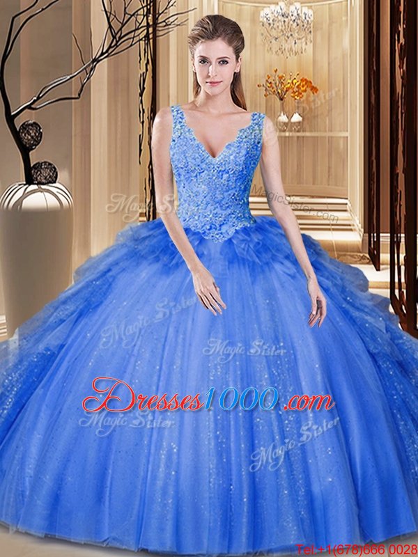 Fine Royal Blue Tulle Backless Ball Gown Prom Dress Sleeveless Floor Length Sequins and Pick Ups