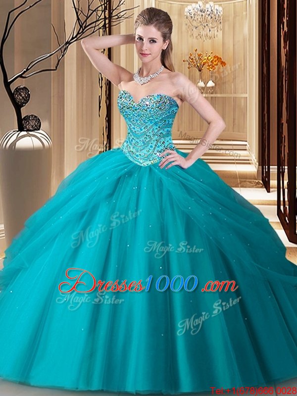 Custom Made Sweetheart Sleeveless Sweet 16 Dress Floor Length Beading Teal Tulle