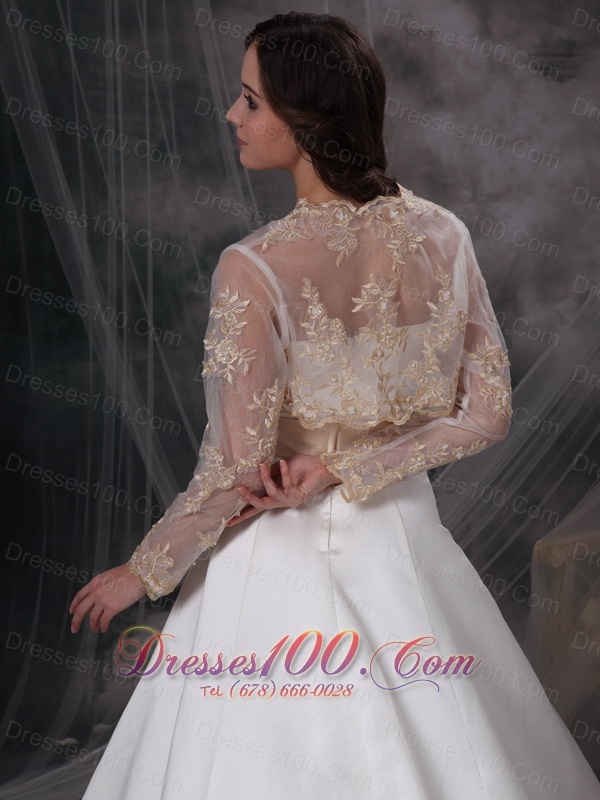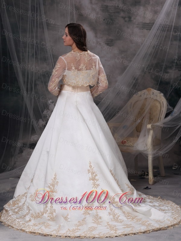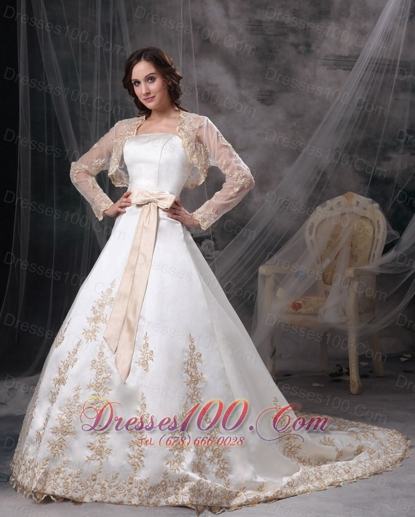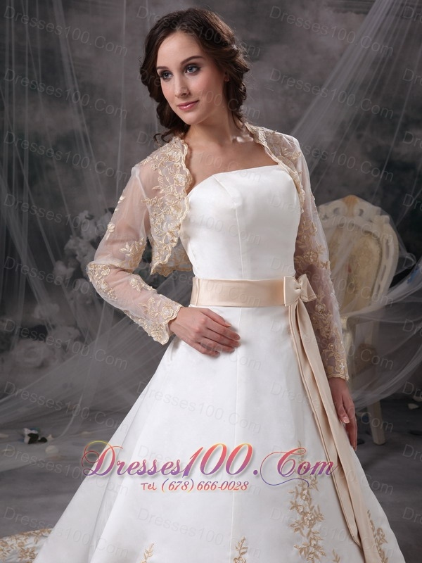 You will be the most beautiful bride in this wonderful wedding dress. The strapless dress features a long bowknot in the waist and embriodery in the skirt make this dress unique. The floor length skirt with a chapel train make the dress like a blooming flower. Little cute lace jacket add implicative beauty. You will be a shinning star in your wedding.