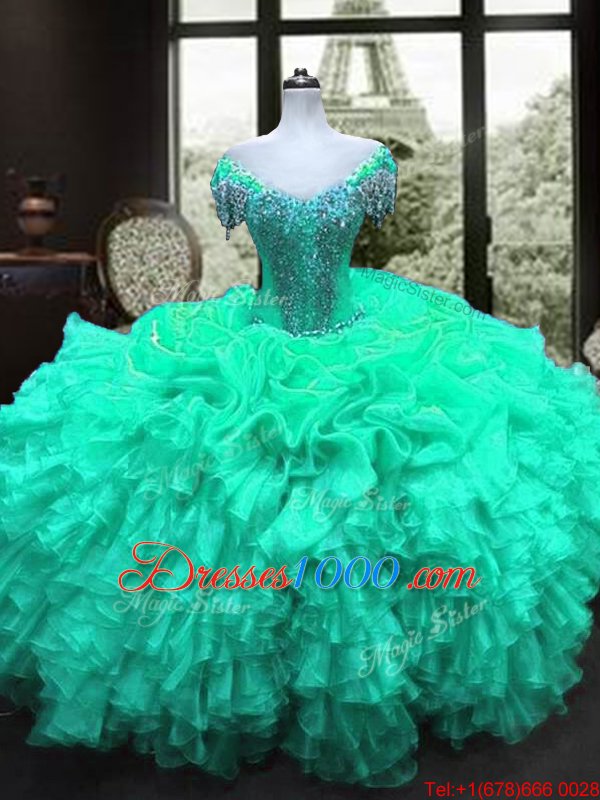 Inexpensive Turquoise Sweetheart Lace Up Beading and Ruffles 15th Birthday Dress Cap Sleeves