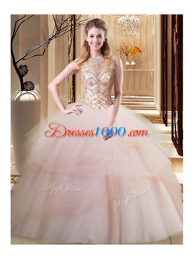 Decent Ruffled Scoop Sleeveless Brush Train Lace Up Quinceanera Dresses Peach Tulle