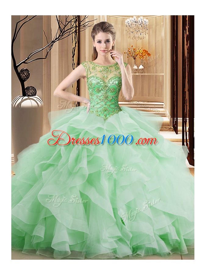 Scoop Sleeveless Tulle Quinceanera Gowns Beading and Ruffles Brush Train Lace Up