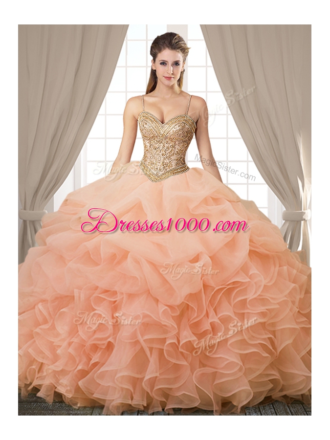 Pick Ups Floor Length Ball Gowns Sleeveless Peach Sweet 16 Quinceanera Dress Lace Up