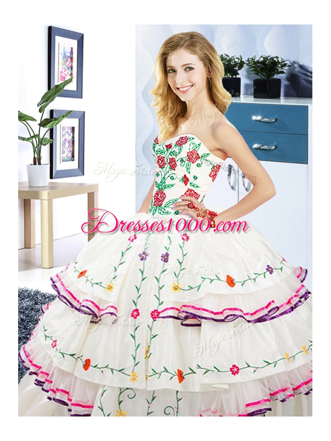 Fantastic White Organza and Taffeta Lace Up Ball Gown Prom Dress Sleeveless Floor Length Embroidery and Ruffled Layers