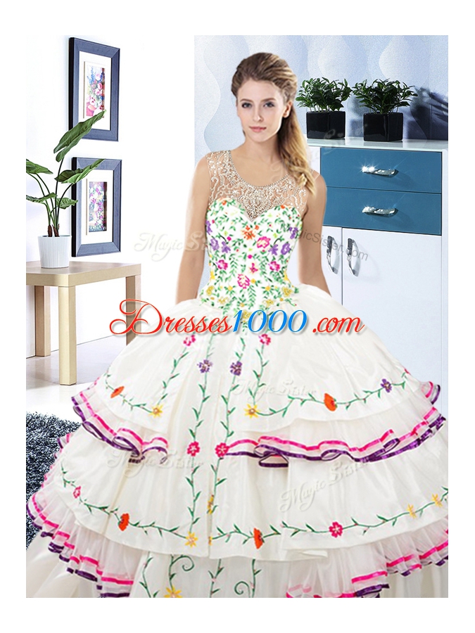 Stylish Scoop Sleeveless Quinceanera Dresses Floor Length Beading and Embroidery and Ruffled Layers White Organza and Taffeta