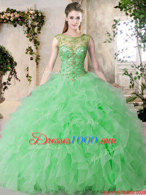 Cute Scoop Sleeveless Organza Floor Length Lace Up Quinceanera Gowns in Green for with Beading and Ruffles