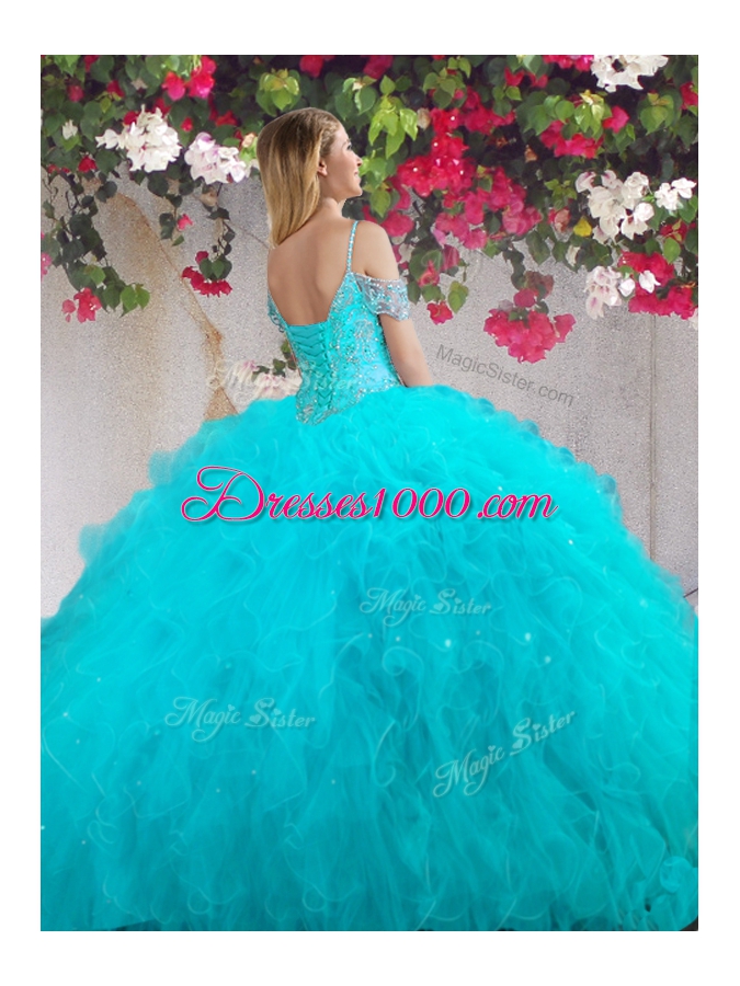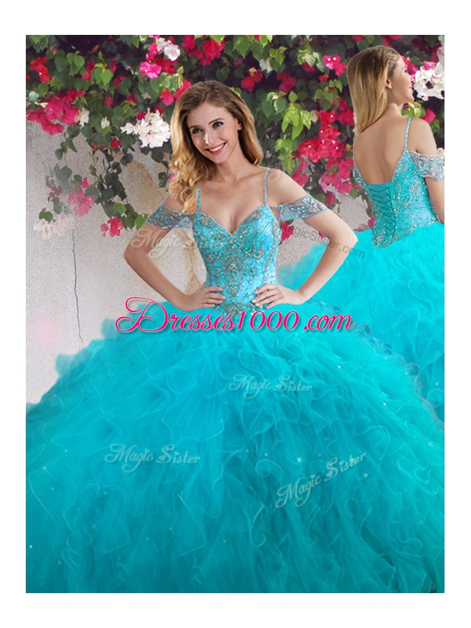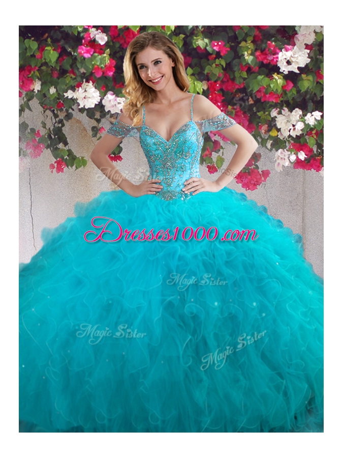Luxurious Off the Shoulder Teal Sleeveless Beading and Ruffles Floor Length Quinceanera Gowns