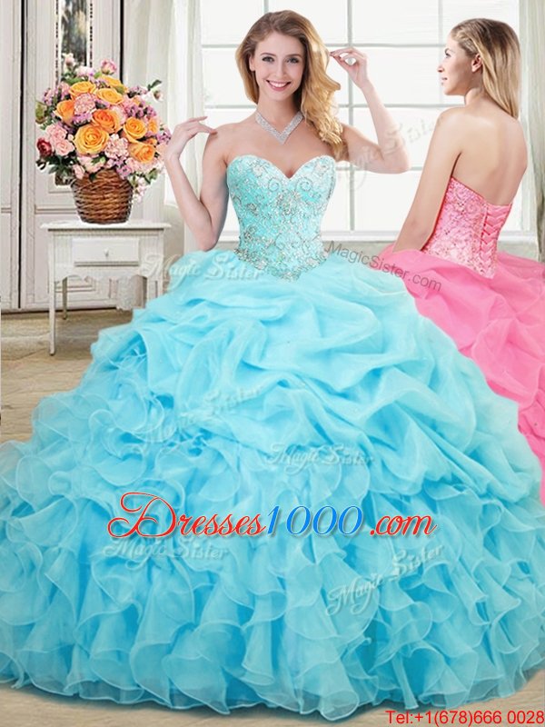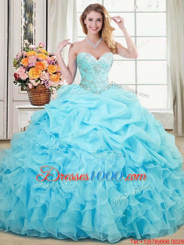 Edgy Floor Length Lace Up Sweet 16 Quinceanera Dress Aqua Blue and In for Military Ball and Sweet 16 and Quinceanera with Beading and Ruffles and Pick Ups