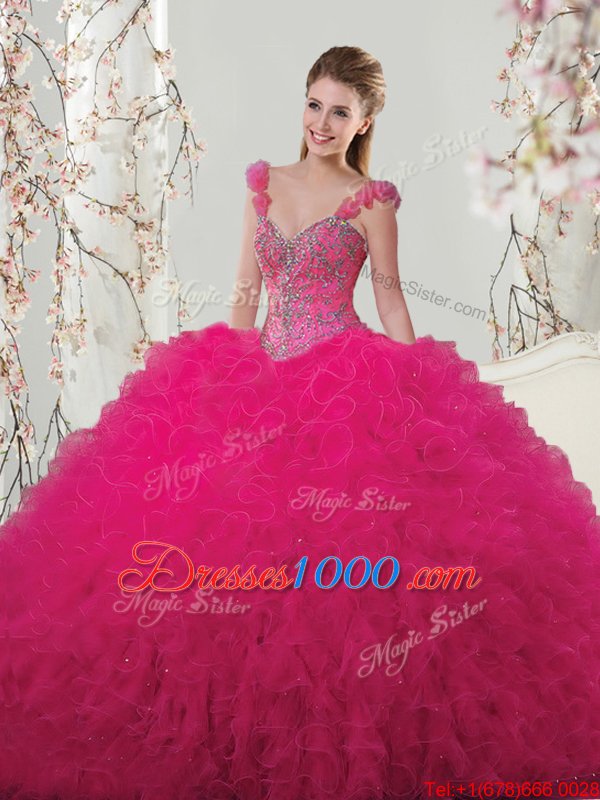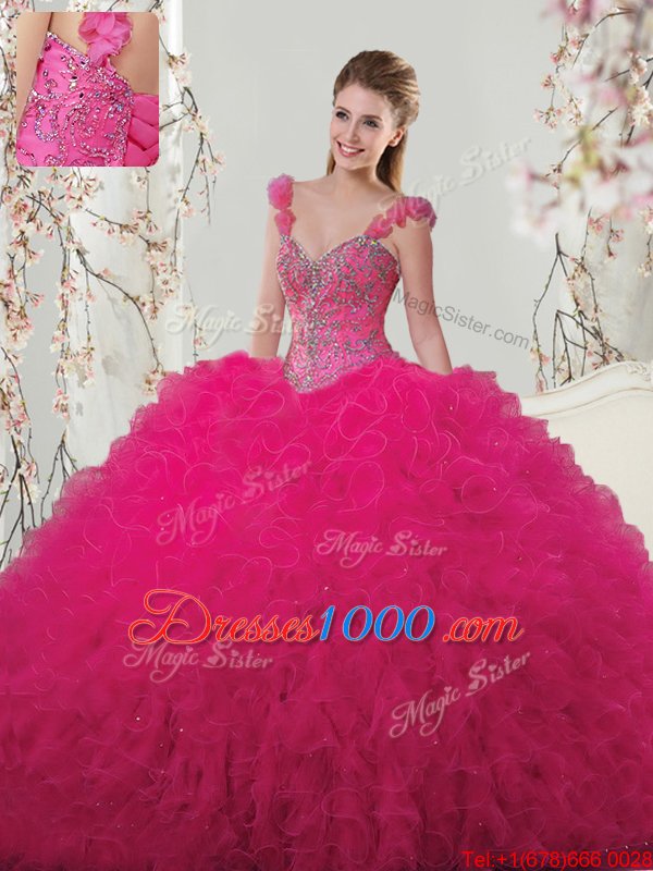 Straps Straps Beading and Ruffles and Hand Made Flower Sweet 16 Quinceanera Dress Hot Pink Lace Up Sleeveless Floor Length