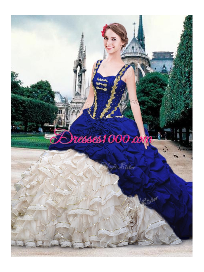 Nice Blue And White Lace Up Straps Beading and Ruffles and Pick Ups Quince Ball Gowns Organza and Taffeta Sleeveless Brush Train