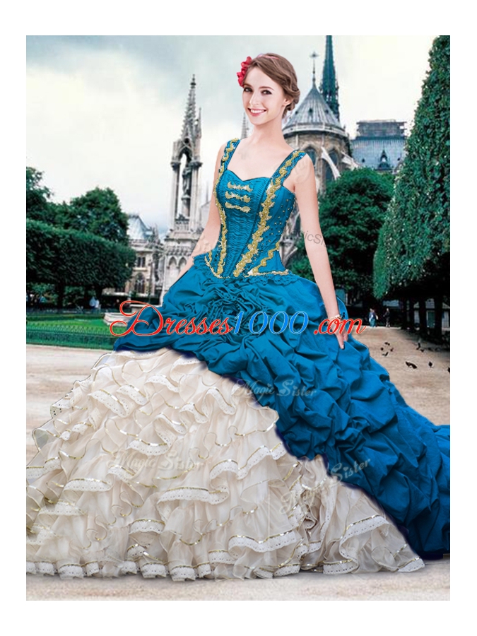Pick Ups Straps Sleeveless Brush Train Lace Up Quinceanera Dress Blue And White Organza and Taffeta