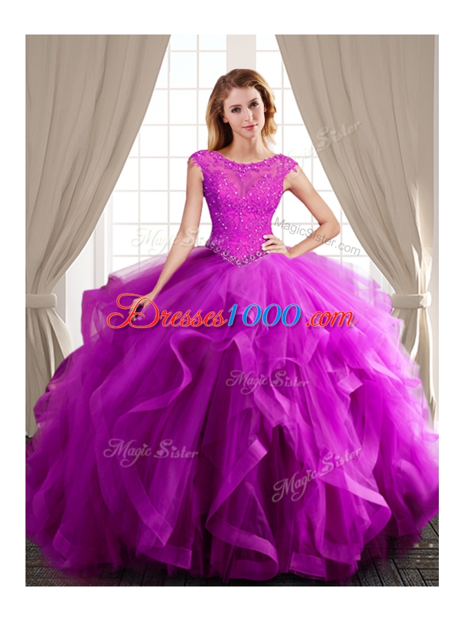 Glittering Fuchsia Tulle Lace Up Scoop Cap Sleeves With Train Sweet 16 Quinceanera Dress Brush Train Beading and Appliques and Ruffles