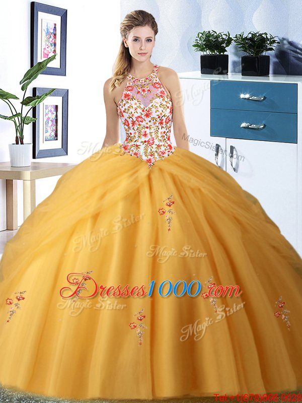 Low Price Halter Top Sleeveless Tulle Quinceanera Dresses Embroidery and Pick Ups Lace Up