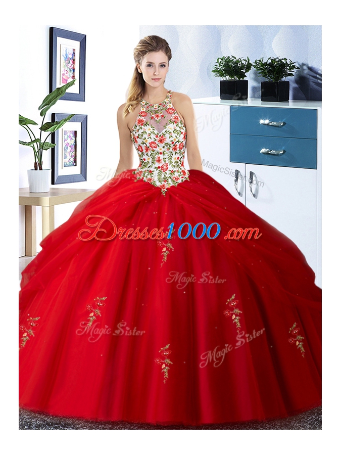 Red Ball Gowns Halter Top Sleeveless Tulle Floor Length Lace Up Embroidery and Pick Ups Quince Ball Gowns