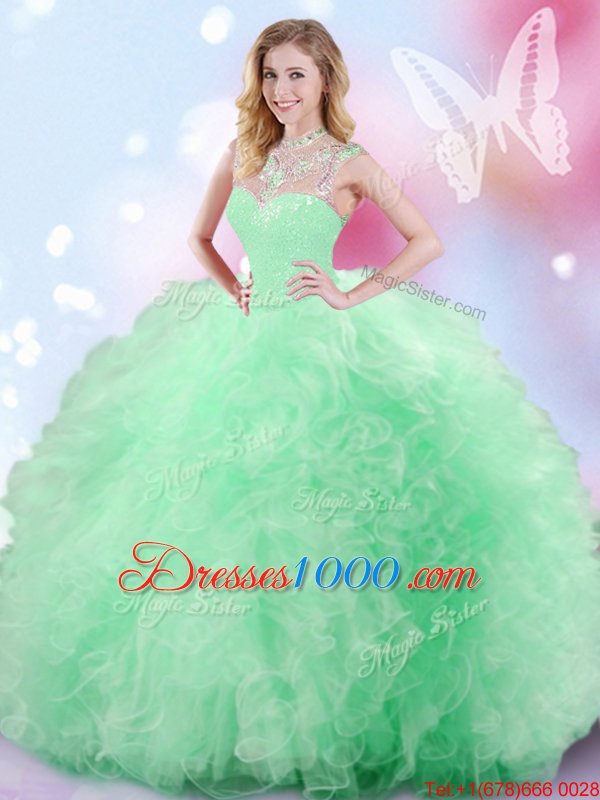 Fine Apple Green High-neck Neckline Beading and Ruffles and Sequins Sweet 16 Dress Sleeveless Zipper