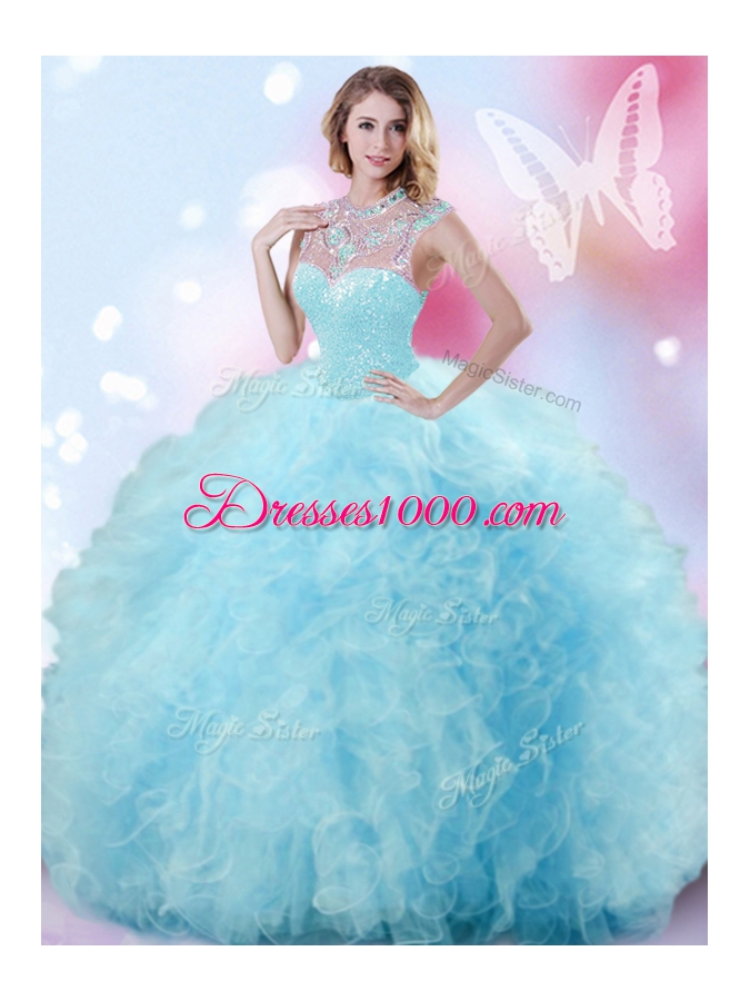 Trendy Light Blue Ball Gowns Tulle High-neck Sleeveless Beading and Ruffles and Pick Ups Floor Length Zipper Sweet 16 Dress