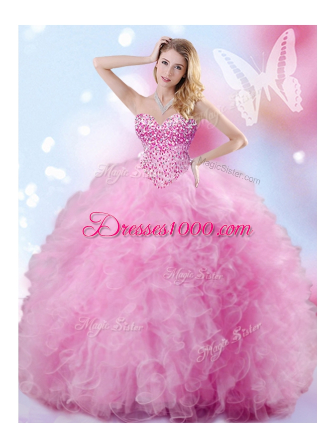 Sleeveless Floor Length Beading and Ruffles Lace Up 15 Quinceanera Dress with Rose Pink