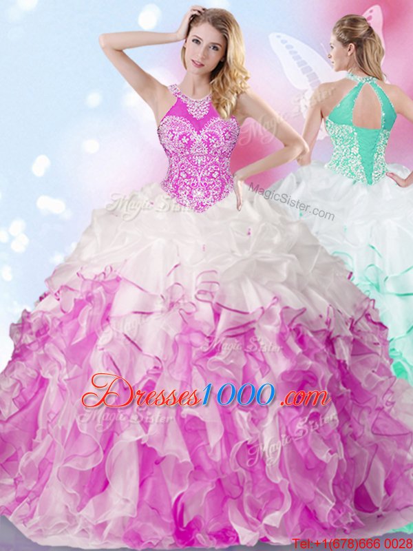 Stunning Multi-color Ball Gowns Organza Halter Top Sleeveless Beading and Ruffles and Pick Ups Floor Length Lace Up Sweet 16 Dress