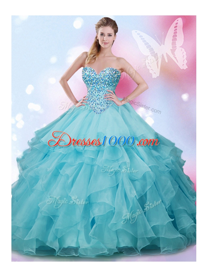 Shining Organza Sweetheart Sleeveless Lace Up Beading and Ruffles 15 Quinceanera Dress in Aqua Blue