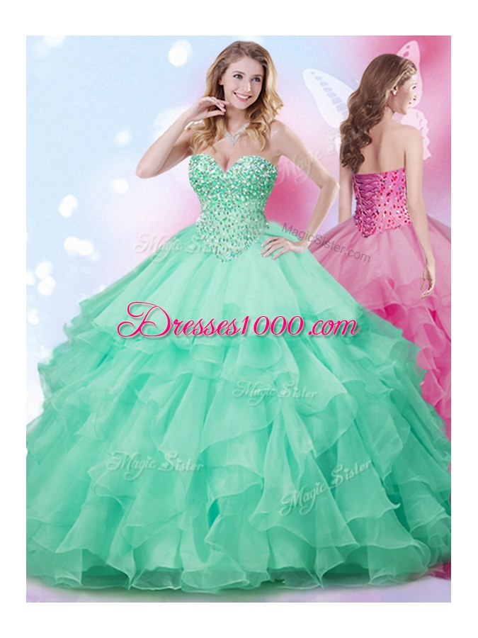 Pretty Sleeveless Floor Length Beading and Ruffles Lace Up Quinceanera Gowns with Apple Green
