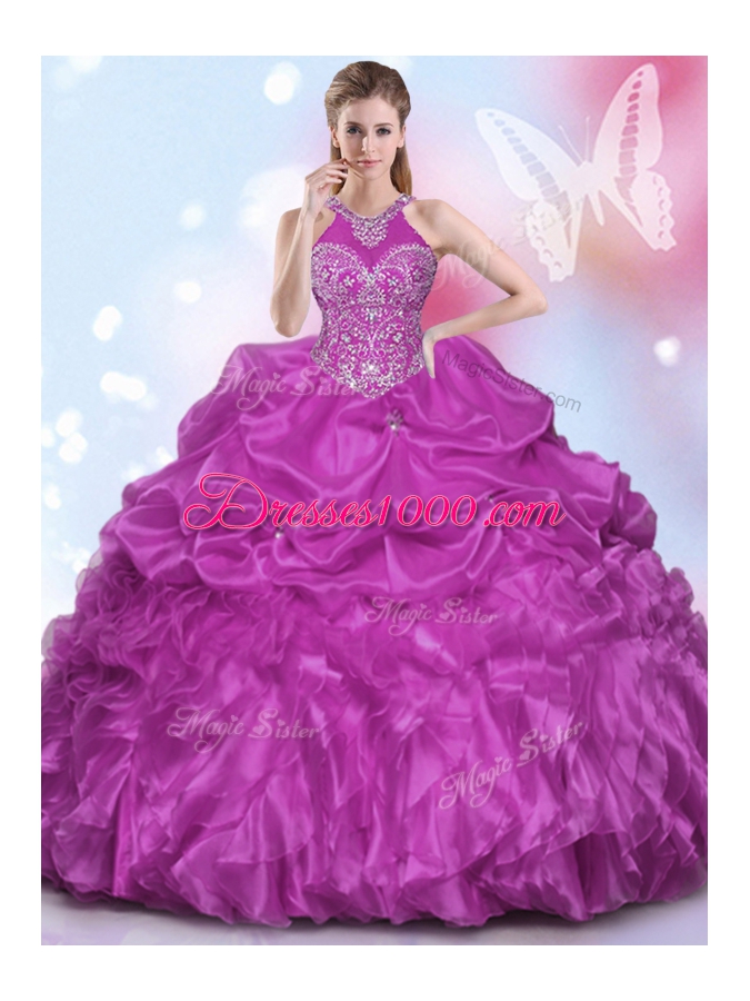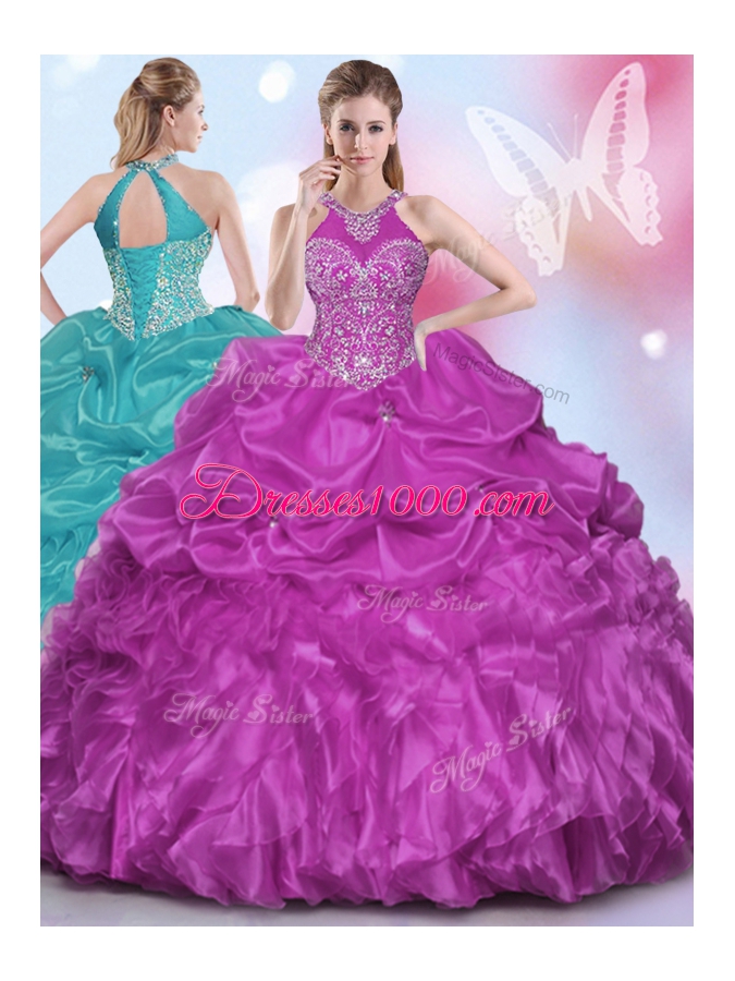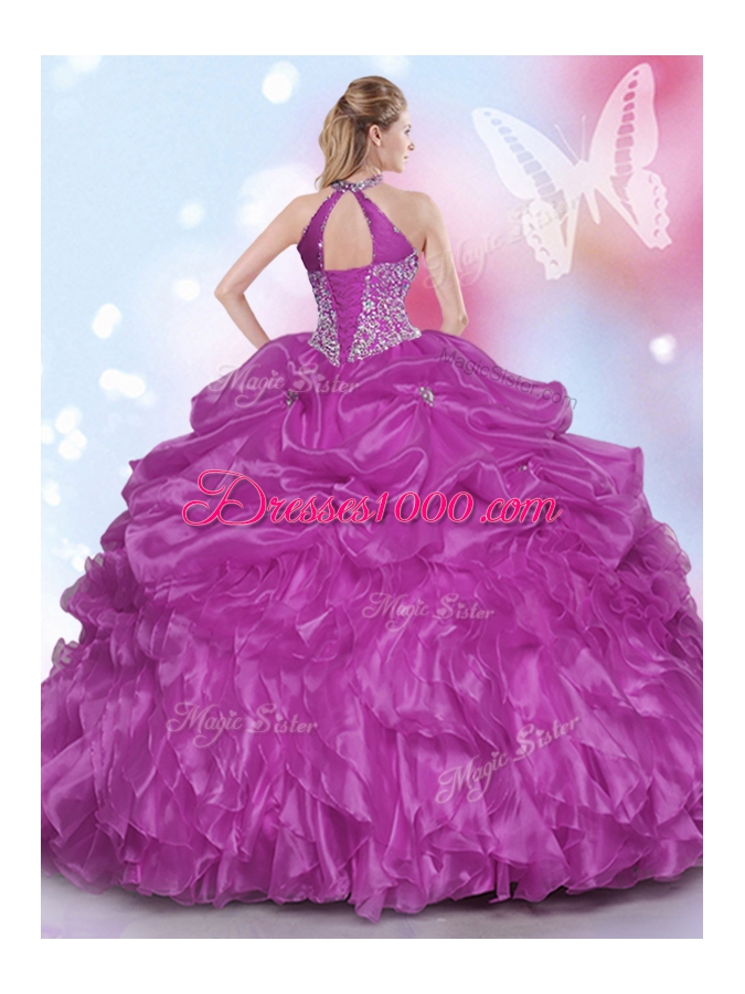 Most Popular Halter Top Sleeveless Floor Length Appliques and Pick Ups Lace Up Sweet 16 Dress with Fuchsia