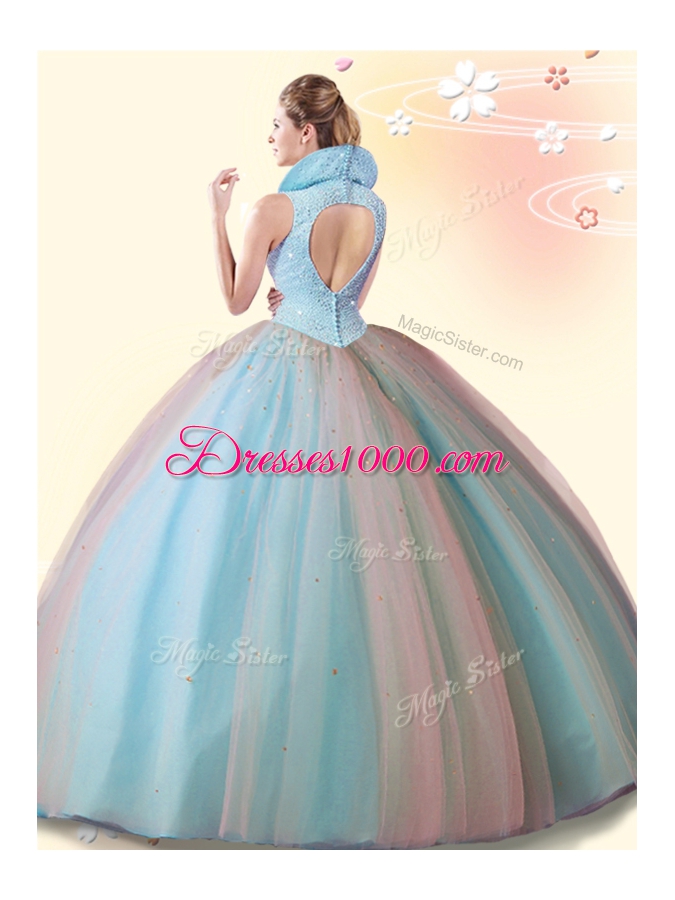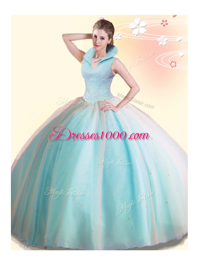 Aqua Blue Sleeveless Floor Length Beading Backless Quince Ball Gowns