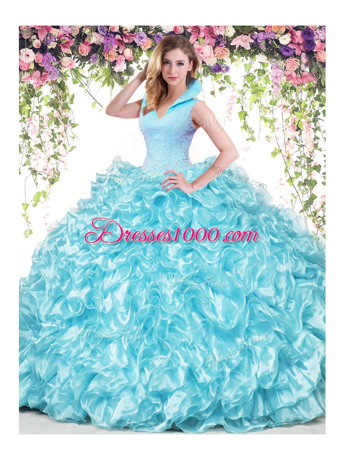 Aqua Blue Ball Gowns Beading and Ruffles Sweet 16 Dress Backless Organza Sleeveless Floor Length