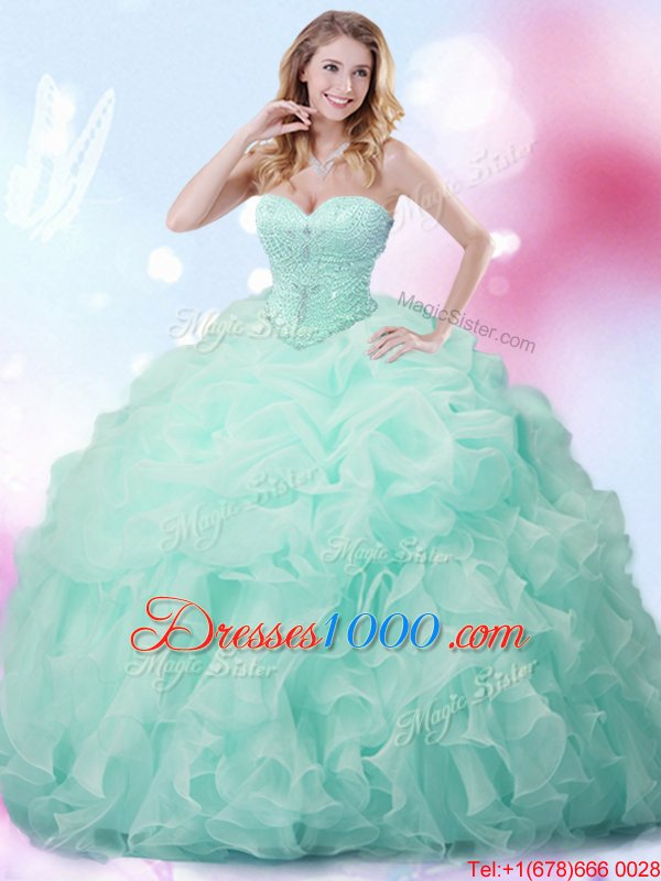 Admirable Sweetheart Sleeveless Quinceanera Gown With Brush Train Beading and Ruffles and Pick Ups Apple Green Organza