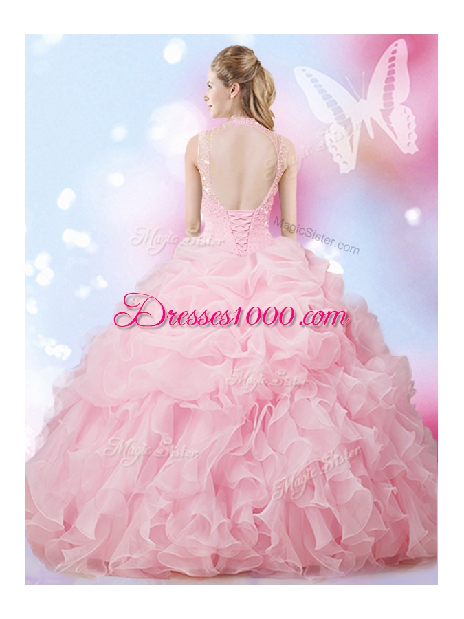New Arrival Baby Pink Ball Gowns Organza High-neck Sleeveless Beading and Ruffles and Pick Ups Floor Length Lace Up Sweet 16 Dress