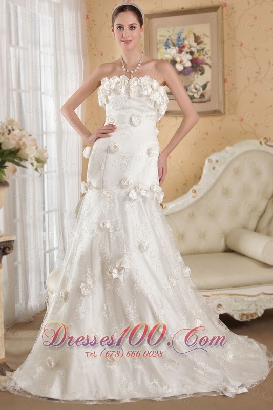 We love a mini-mermaid style and are sure the princess in you will love this one, too.It features a wrapped texture on the bodice,a strapless neckline and lace and taffeta fabric throighout the bodice. The applique flowers around the bustline and on bodice. The skirt extends into a gorgeous sweeping train and a corset-style closure completes the design.