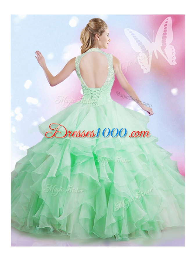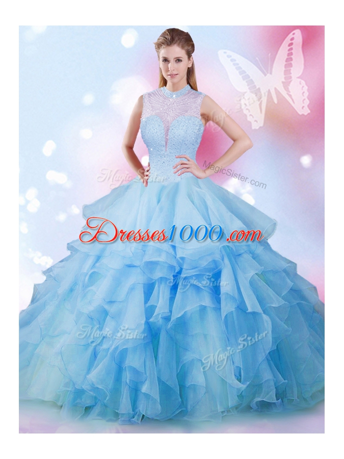 High-neck Sleeveless Sweet 16 Quinceanera Dress Floor Length Beading and Ruffles Baby Blue Tulle