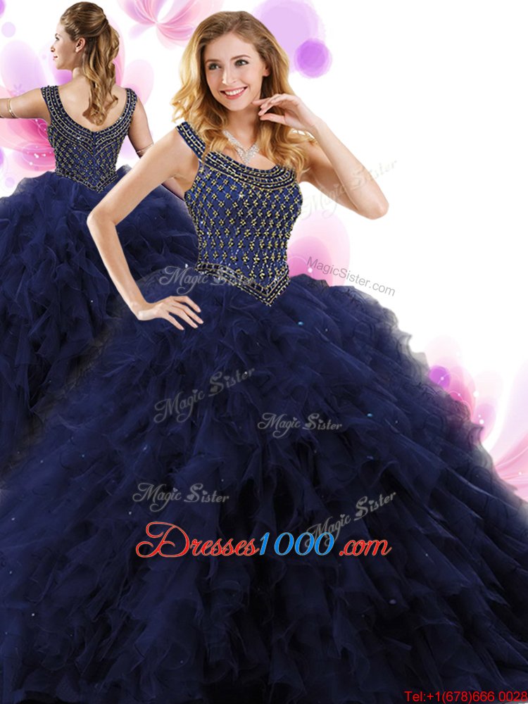 Sumptuous Scoop Navy Blue Ball Gowns Beading and Ruffles 15th Birthday Dress Zipper Tulle Sleeveless Floor Length