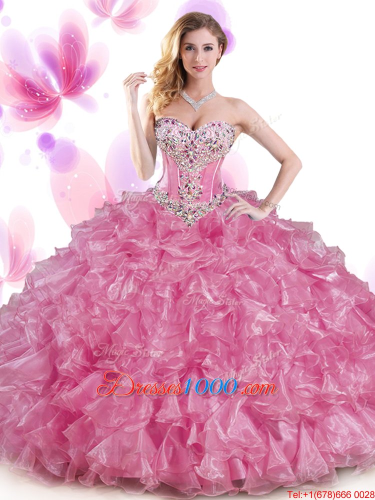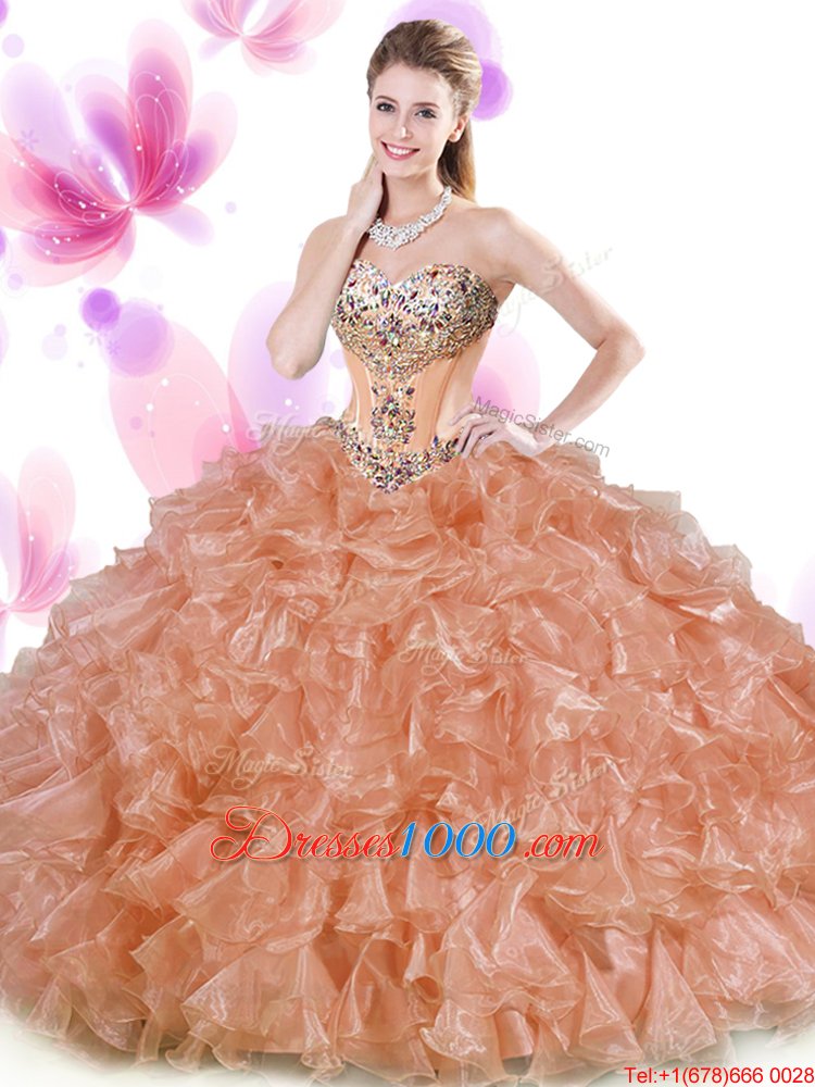 Rust Red and Peach Organza Lace Up Sweetheart Sleeveless Floor Length Quince Ball Gowns Beading and Ruffles