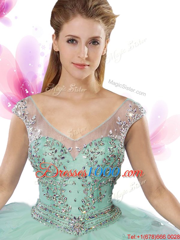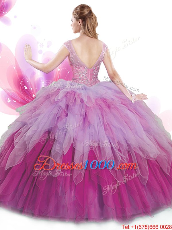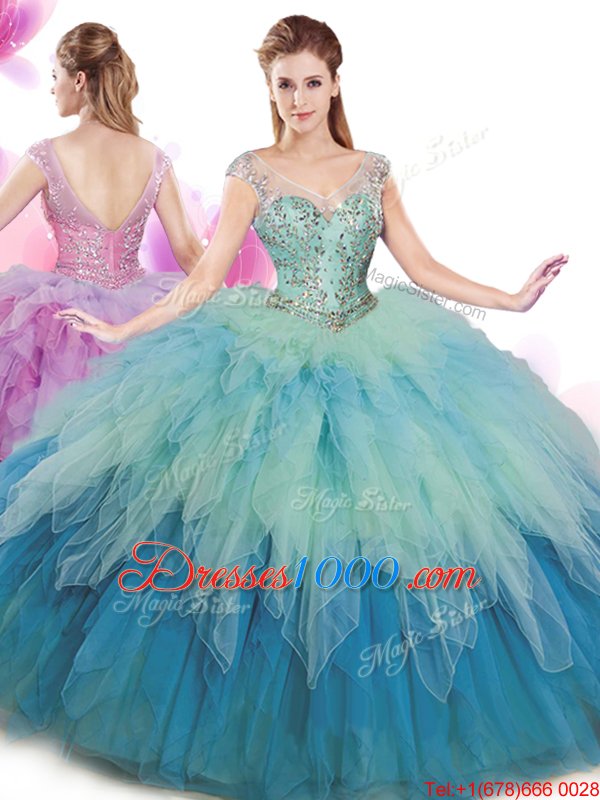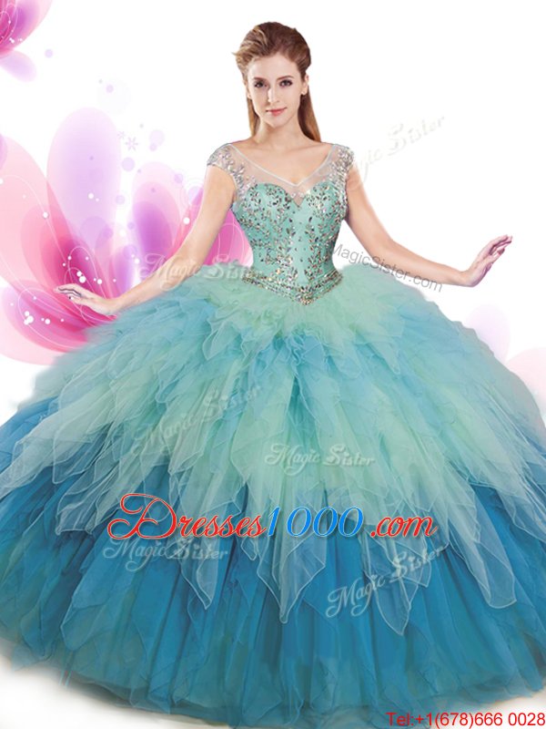 Hot Sale Cap Sleeves Tulle Floor Length Lace Up Sweet 16 Quinceanera Dress in Multi-color for with Beading and Ruffles