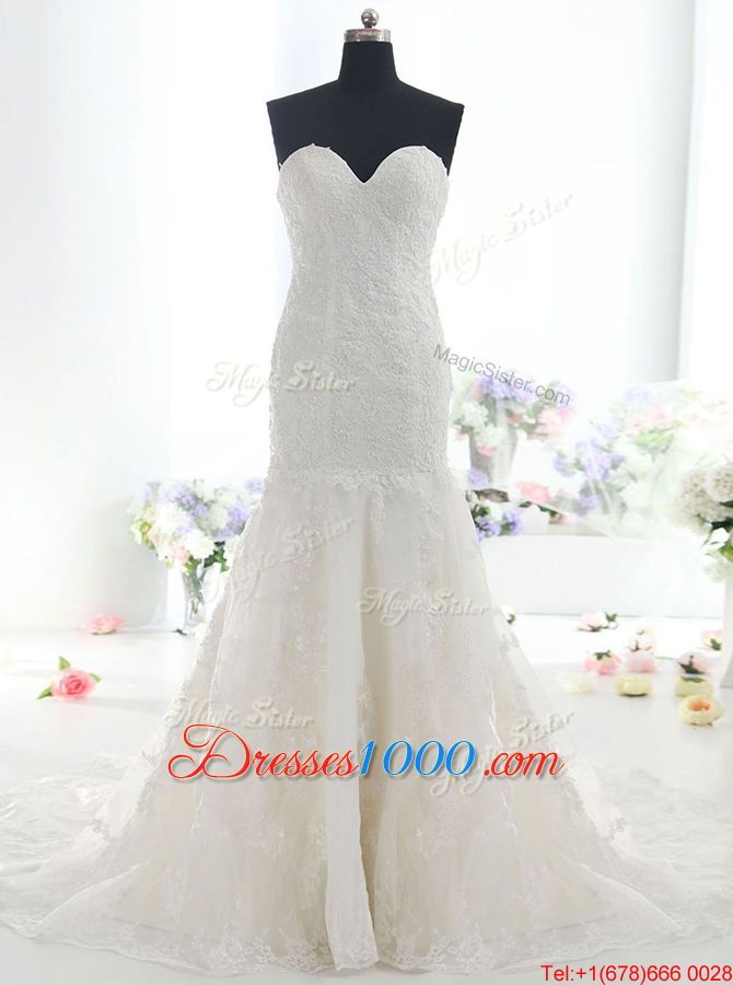 Latest Mermaid White Wedding Gown Wedding Party and For with Lace Sweetheart Sleeveless Brush Train Backless