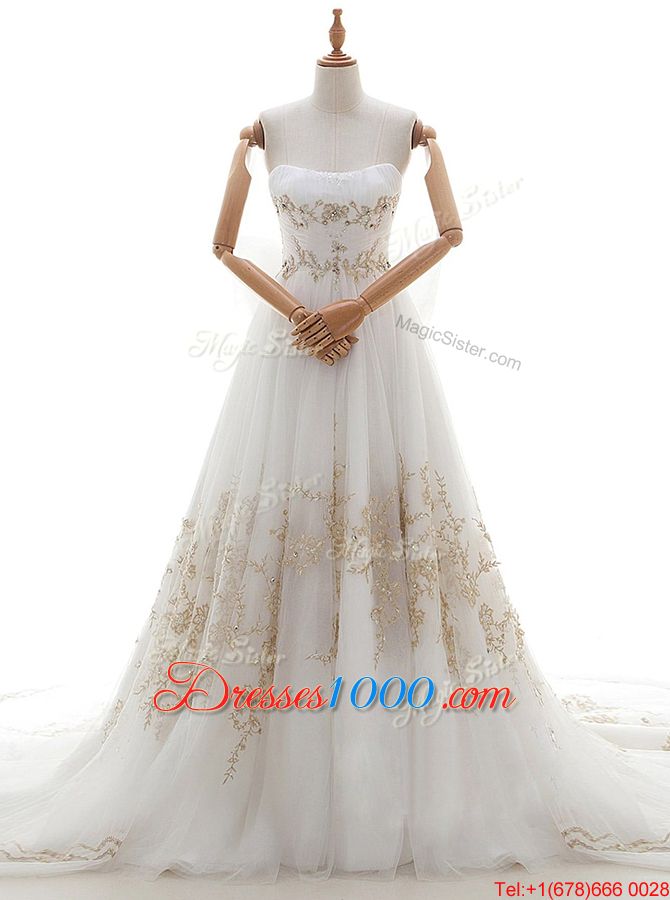 Glittering Sleeveless Tulle With Train Chapel Train Lace Up Wedding Gowns in White for with Appliques and Bowknot